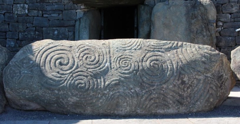 The entrance stone to the main passage tomb at Newgrange is three metres long, 1.5 metres diameter, and weighing 5 tonnes, yet its significance defies our comprehension. The rising sun in the week of the winter solstice illuminates the central chamber of the mound.
