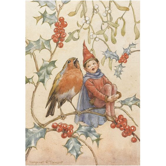 Footer illustration : Margaret Tarrant drawing of robin and elf duet in the holly and mistletoe, from Sothebys.com